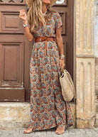 يتميز هذا الفستان الطويل البوهيمي بنقوش زهرية دقيقة وقصة انسيابية. يضيف ياقة على شكل V وأكمام قصيرة لمسة أنثوية ومريحة. مثالي للأيام المشمسة، فهو يجمع بين الأناقة والراحة.