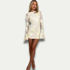 تتميز هذه الفستان المتوسطة الطول بتطريزها الزهري الدقيق وأكمامها الطويلة الشفافة قليلاً. ظهرها المكشوف يضيف لمسة من الأنوثة الخفية، مثالي للمناسبات الخاصة. متوفر بعدة ألوان، يتكيف مع جميع رغباتكم بأناقة.