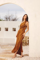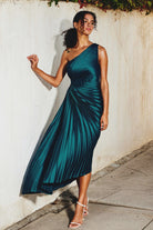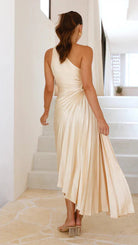 تجذب هذه الفستان الطويل المسائي بقصته الجريئة ذات الحمالة الواحدة وقماشه المطوي الرقيق. يبرز خصرك المصمم بأناقة، بينما تعطي لمسته السائلة مظهراً أنيقاً. مثالي للتألق في الأحداث الرسمية أو الأمسيات الخاصة.