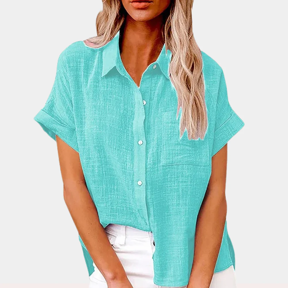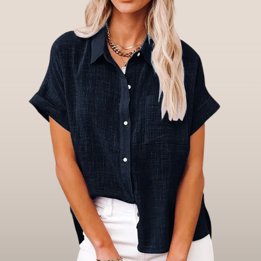 Αυτή η μπλούζα προσφέρει άνετη γραμμή ιδανική για ζεστές ημέρες. Ο κλασικός γιακάς της και το κουμπωτό κλείσιμο προσθέτουν μια κομψή πινελιά. Ιδανική για μια χαλαρή ή επαγγελματική εμφάνιση.