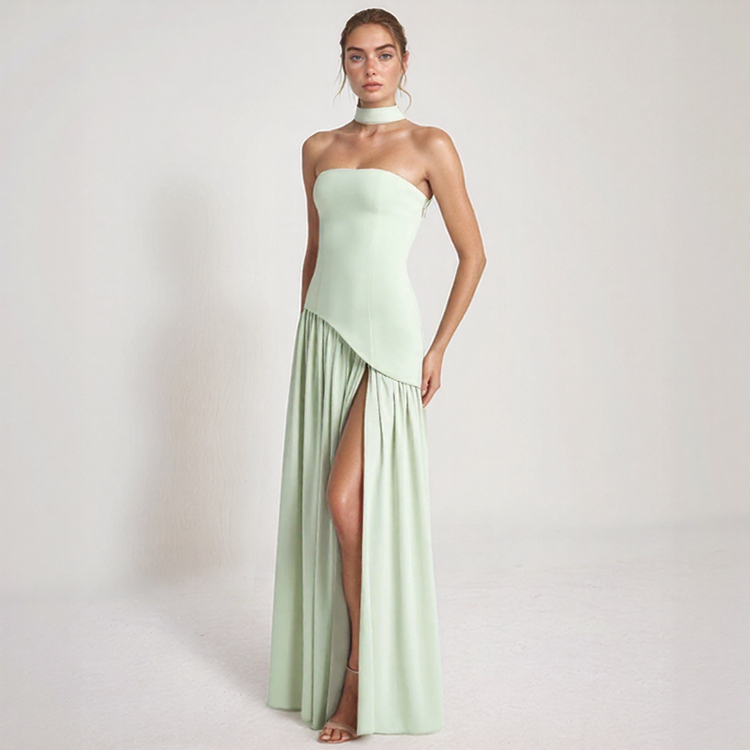 Ez a hosszú ruha kiemeli a sziluettet a strukturált, pánt nélküli fűzőjének köszönhetően. Az oldalsó hasíték nőiességet és magabiztosságot ad. Tökéletes elegáns estékre, ötvözi a bájt és a kényelmet.