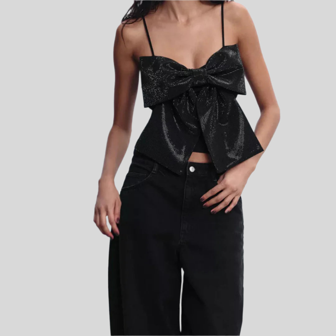 Denne elegante toppen har et glitrende design med en karakteristisk sløyfe. Perfekt for spesielle anledninger eller for å gi et sofistikert preg til din hverdagsantrekk. Tilgjengelig i flere størrelser for å passe alle kroppstyper.