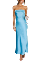 Denne lange, satengkjolen uten stropper former en elegant og feminin silhuett. Lett og luftig, den er ideell for sommerfester, bryllup eller spesielle anledninger. Den silkemyke falden gir et preg av raffinement samtidig som den sikrer optimal komfort. Tilgjengelig i flere farger for å passe til alle stiler.